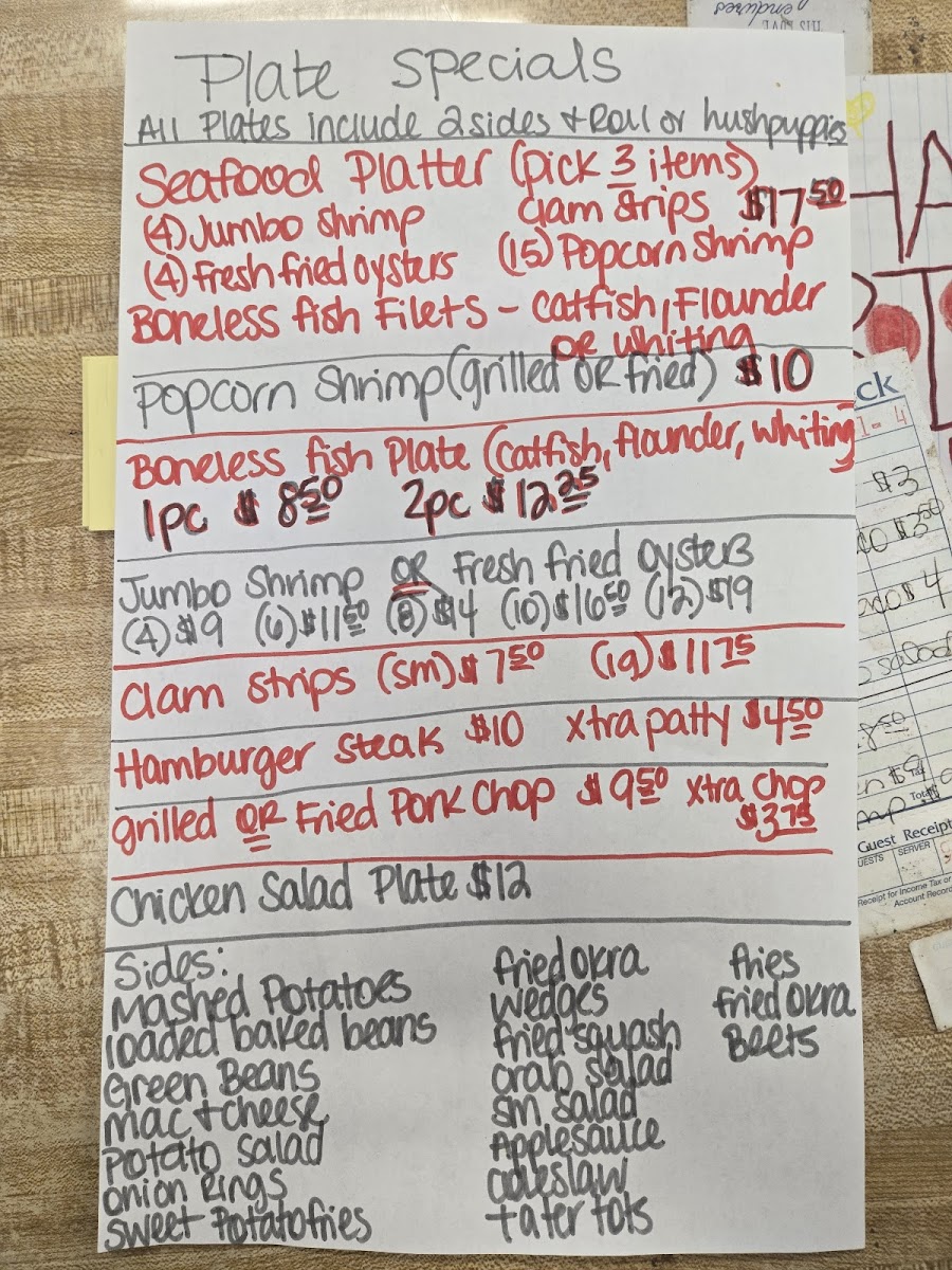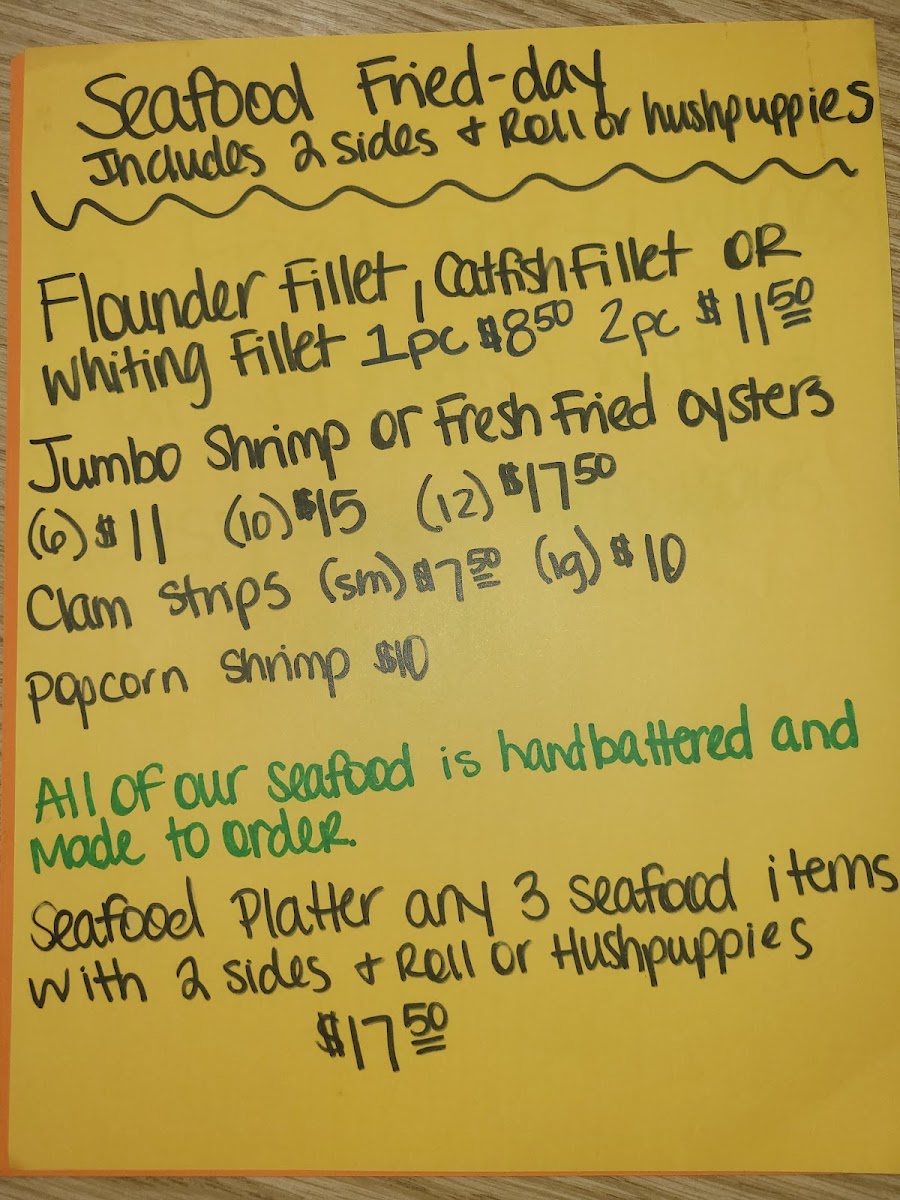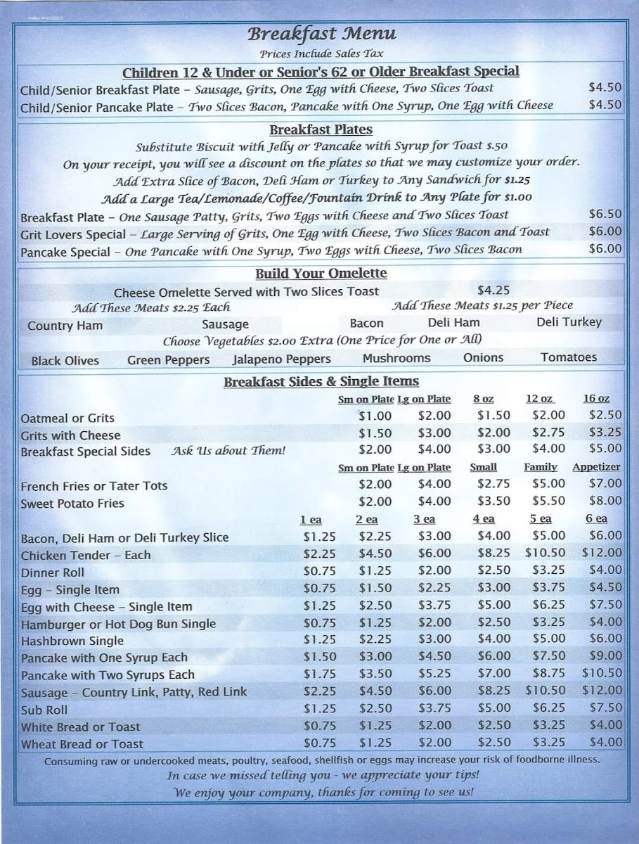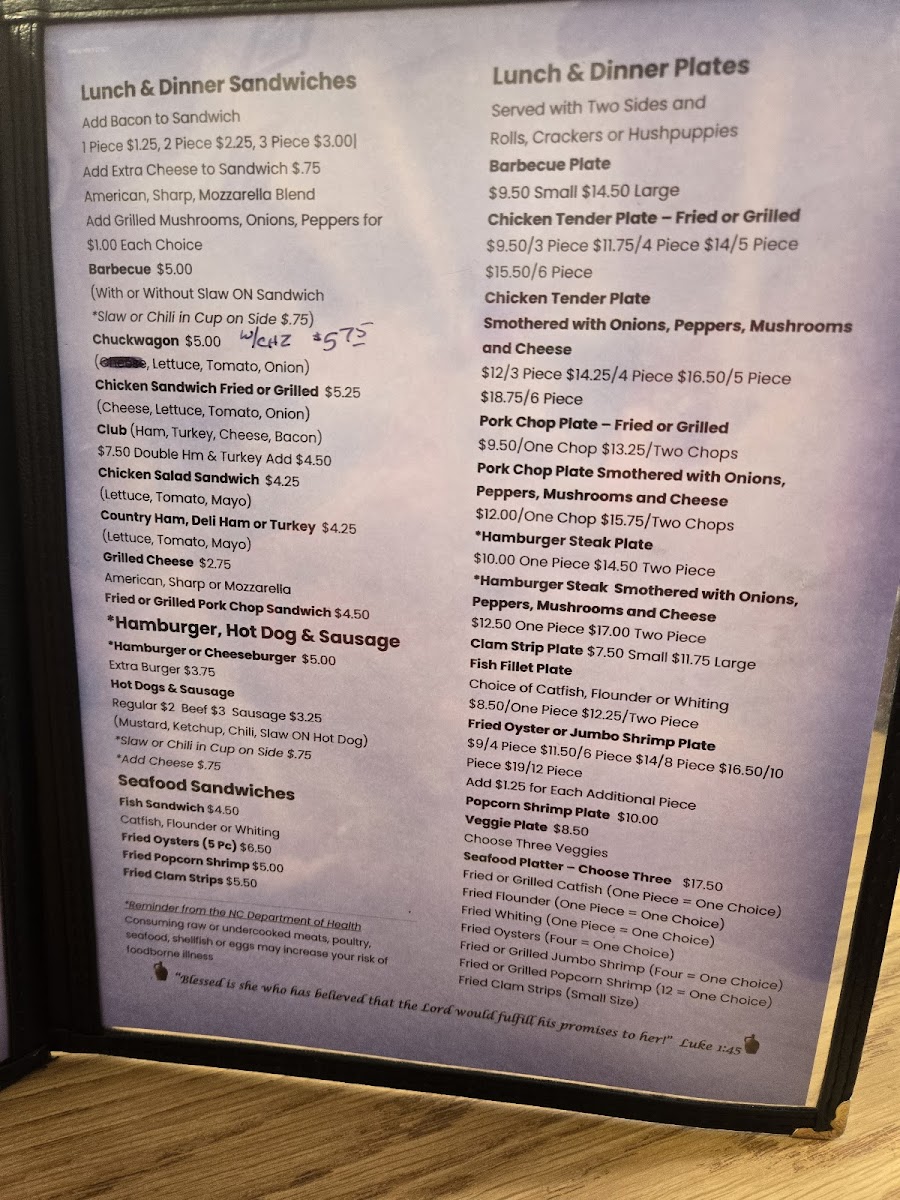 The lunch and dinner menu is robust, with choices like the Barbecue Plate, Chicken Tender Plate, and the Pork Chop Plate (which can be smothered with onions, peppers, mushrooms, and cheese for added flavor). For seafood lovers, options such as Fried Popcorn Shrimp, Clam Strip Plate, and the Seafood Platter (which lets you choose any three seafood items) provide fresh and crispy dishes to satisfy any craving.