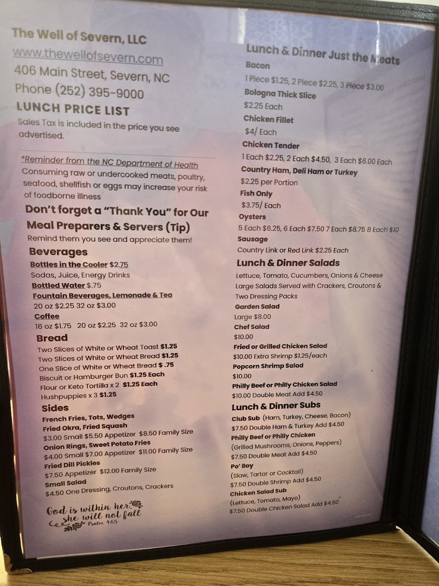 The menu at The Well of Severn LLC offers a delightful array of comfort food, making it a go-to spot for a satisfying meal. The appetizers feature crowd-pleasers like Fried Pickle Chips, a crunchy and tangy start to any meal. For sides, diners can enjoy a variety of choices, including Beets, Fries, Okra Squash, and Side Salad-each priced to offer a hearty accompaniment to any main course. For a refreshing drink, the restaurant has options like Bottled Water, Sodas, and Fountain Beverages, perfect for pairing with your meal.
