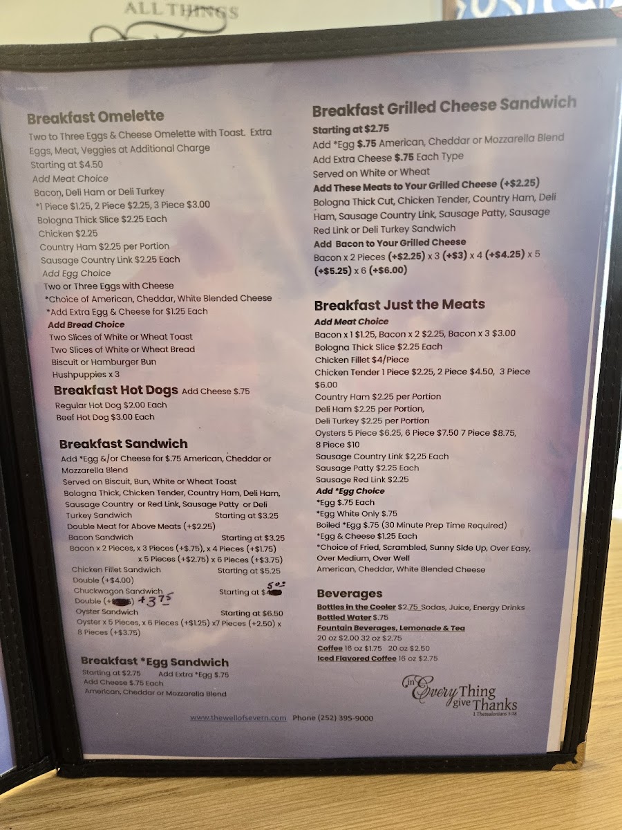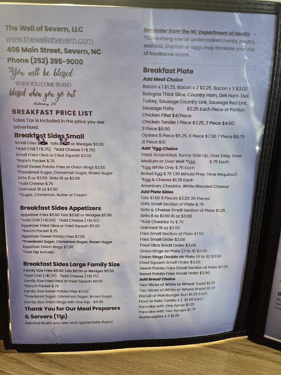 Breakfast at The Well of Severn offers a selection of meats like Chicken Tender or Country Ham, paired with classic sides such as Small Fries, Grits, or Oatmeal. The breakfast plates, including the Grit Lovers Special and Pancake Special, are hearty choices to start the day right.